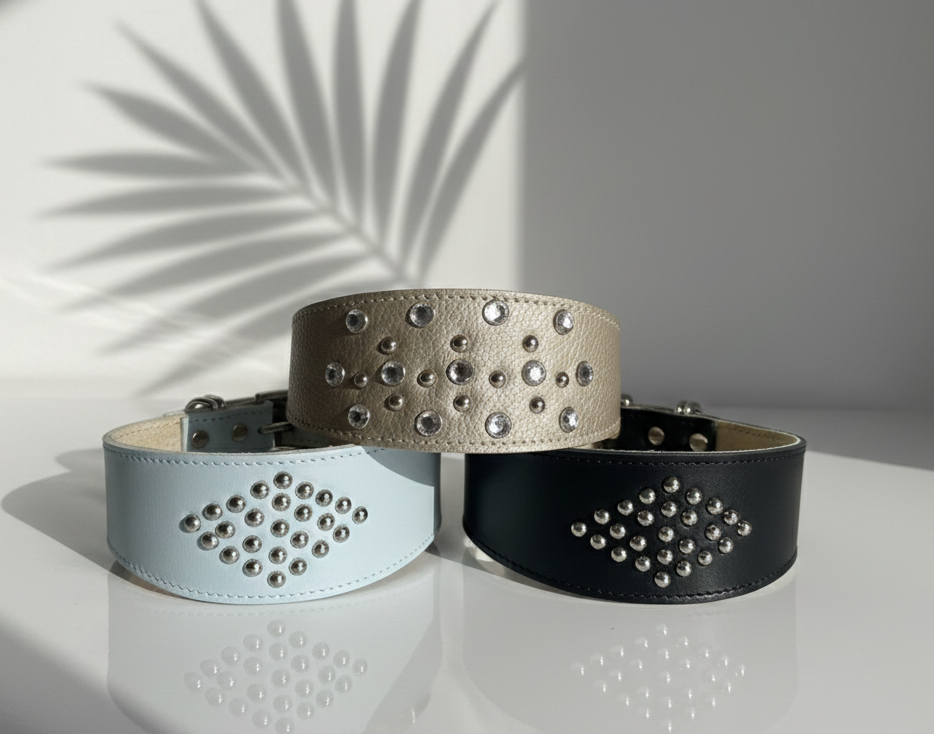 The collar features a distinctive wide profile, carefully shaped for both comfort and visual impact, and is adorned with polished silver studs that add a delicate yet striking detail. Each piece is handmade with attention to quality, durability, and refined craftsmanship.
