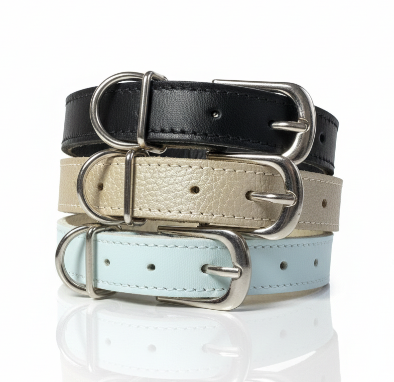 This refined handcrafted leather collar is made from natural genuine leather, combining timeless elegance with modern minimalism. Finished in a soft light blue shade, it brings a subtle, sophisticated accent while maintaining a clean and luxurious aesthetic.