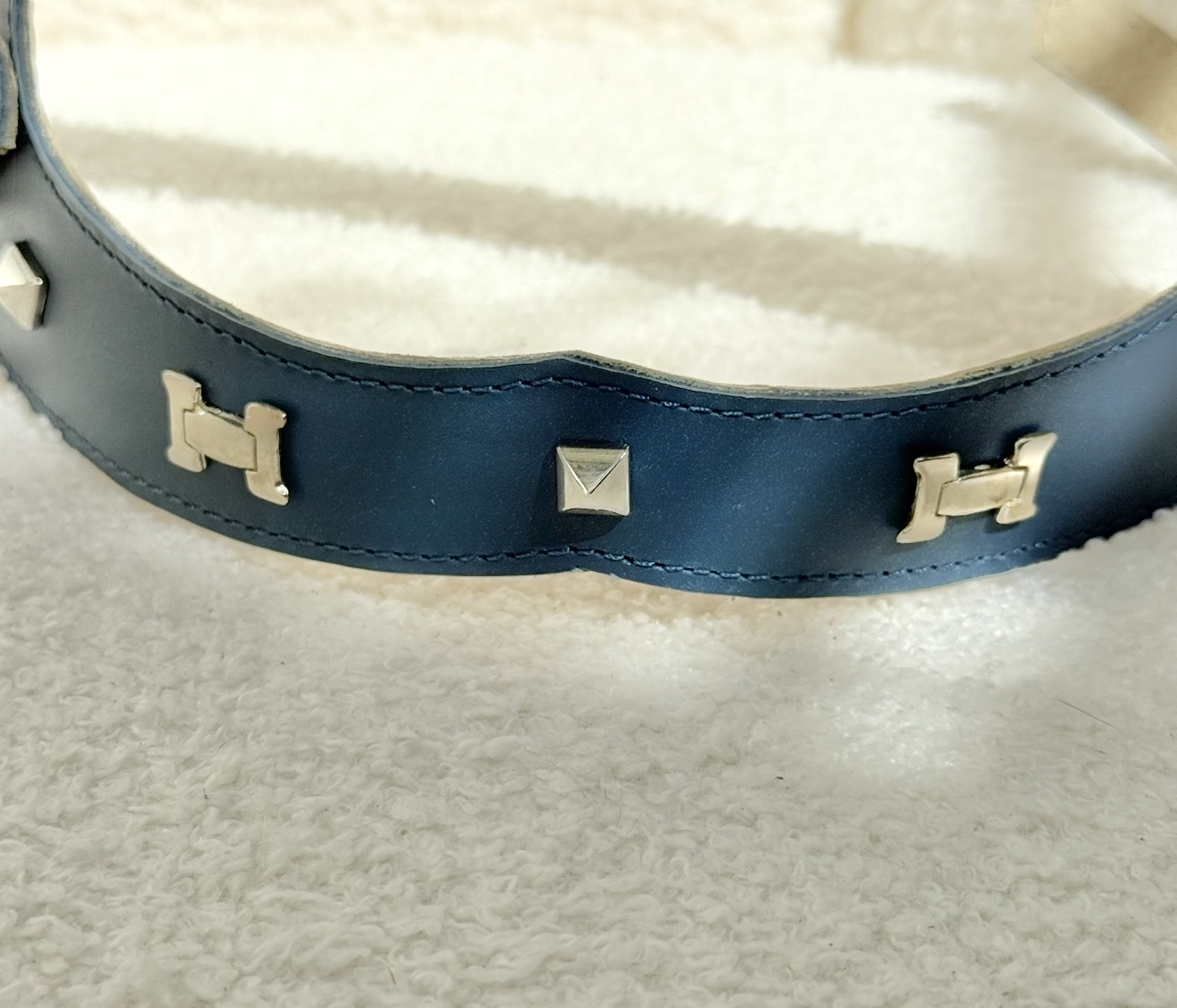 The deep navy tone paired with gleaming silver details exudes understated luxury, making it an essential piece of luxury dog accessories for pets with refined taste.