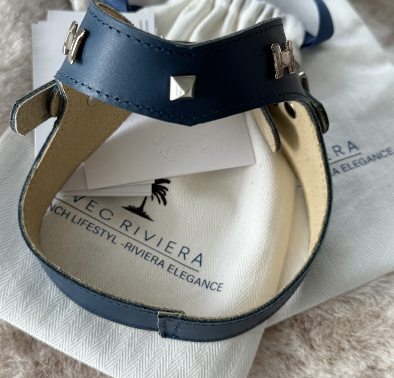 This sophisticated navy blue harness is a perfect blend of style, craftsmanship, and elegance inspired by the timeless charm of the French Riviera.
