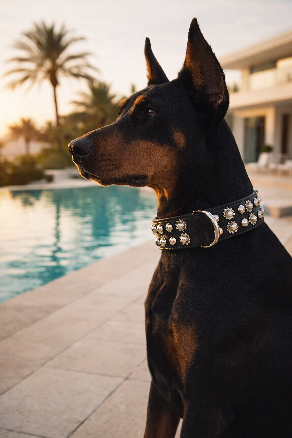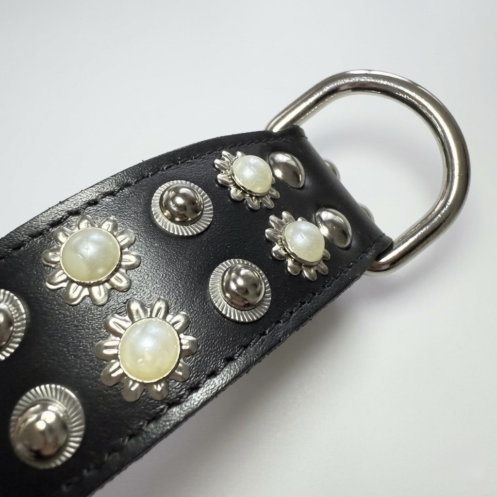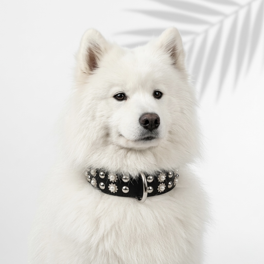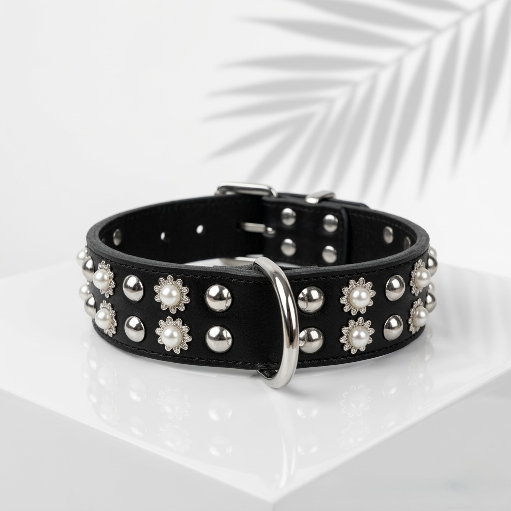 The collar is decorated with elegant pearl-inspired details and polished metal studs, creating a sophisticated jewelry-like design that reflects light beautifully. Each element is carefully placed to achieve a harmonious composition that highlights the collar’s refined character.