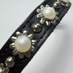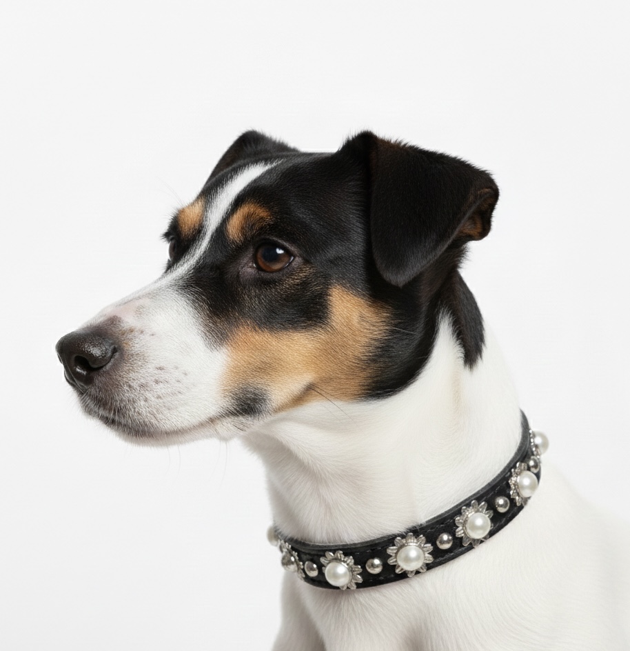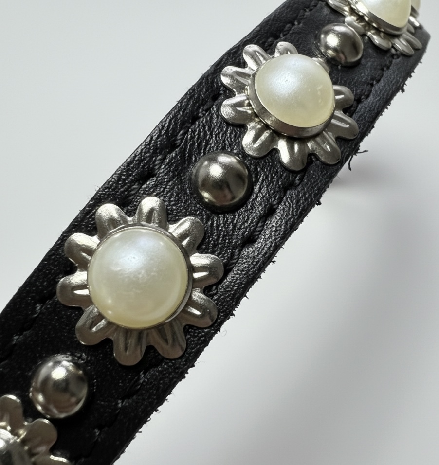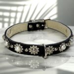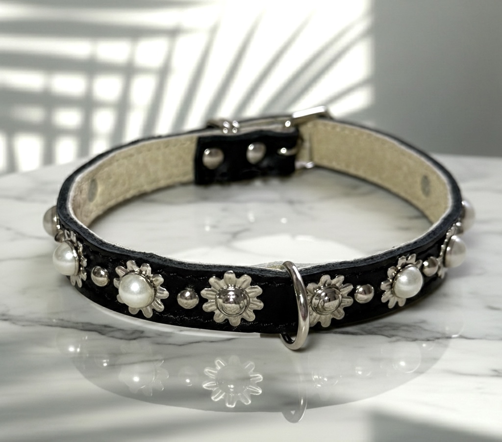 The Chicdog&co luxury dog collar is a refined expression of elegance, craftsmanship, and premium design, created for dogs who deserve truly exceptional accessories. Made from high-quality natural leather in a deep black shade, it is beautifully adorned with delicate pearl details and sophisticated silver-tone floral embellishments.